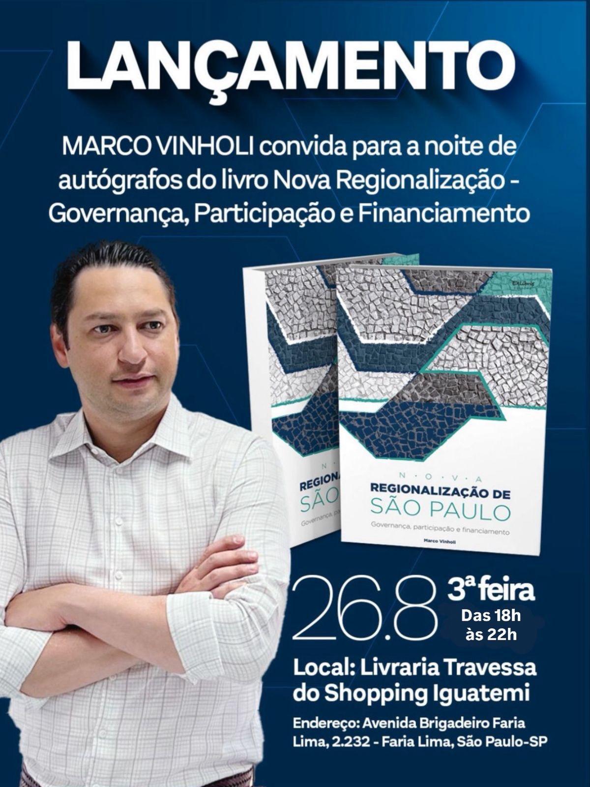 No próximo dia 26 de agosto o Ex- secretário de estado, Ex-deputado estadual e atual Diretor Técnico do Sebrae-SP, Marco Vinholi vai lançar seu segundo livro “Nova Regionalização de São Paulo” no Shopping Iguatemi da Faria Lima.